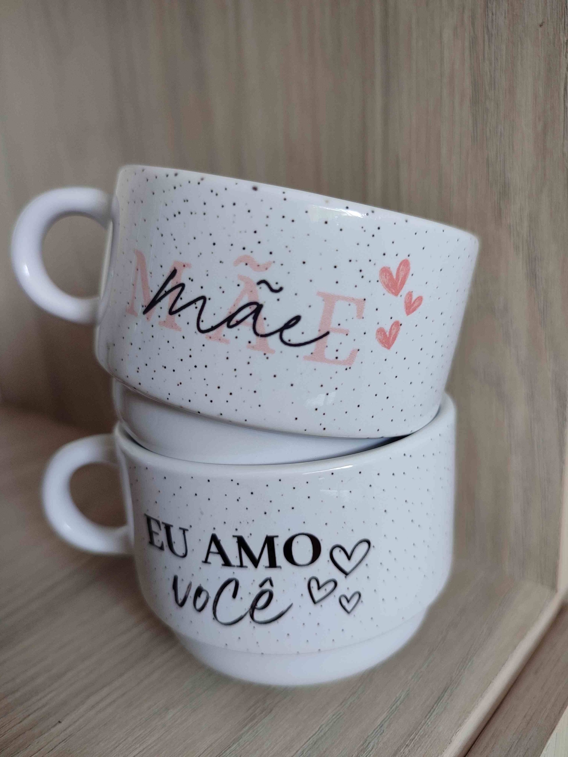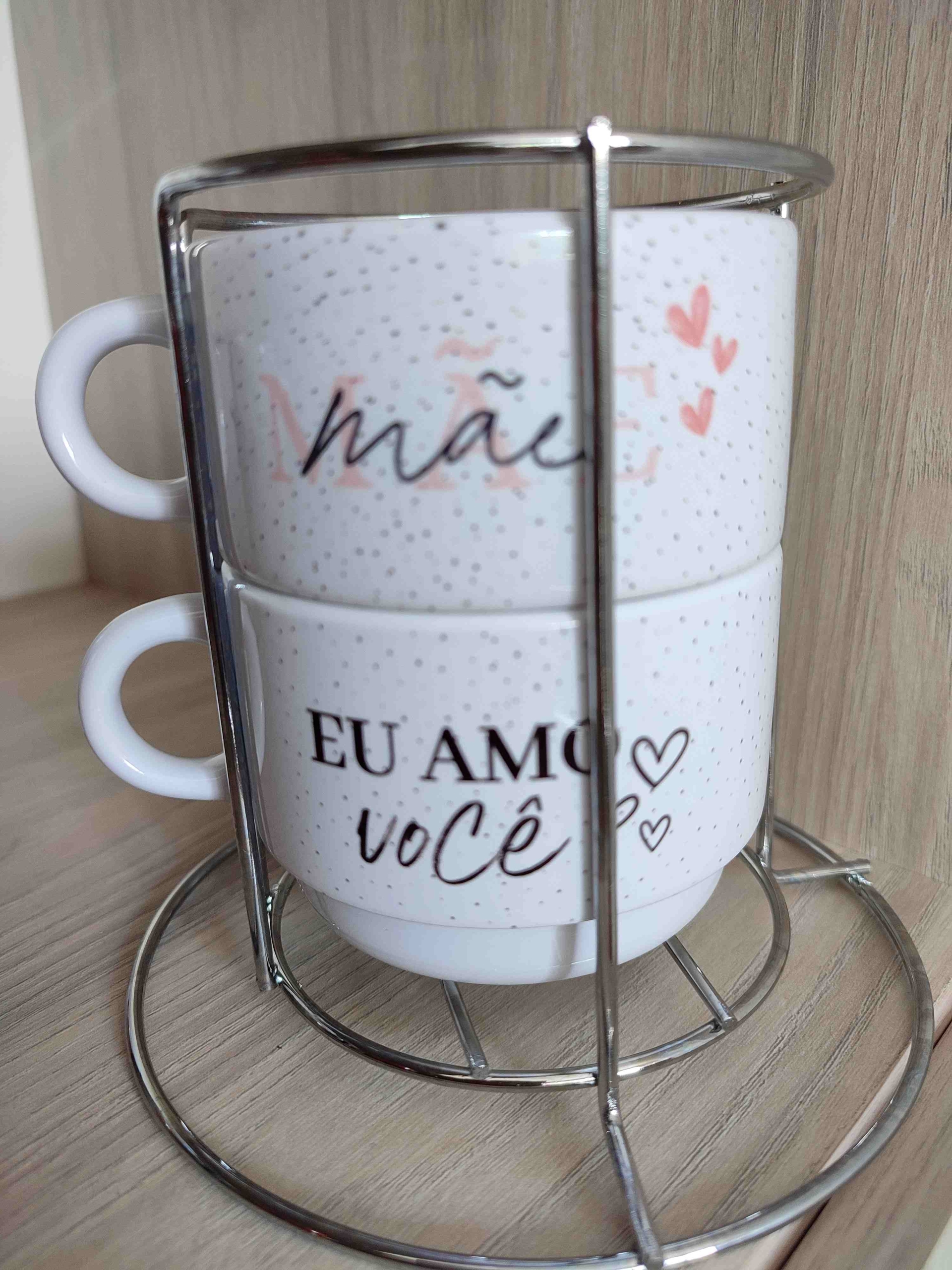 Kit com 2 xicaras de cerâmica branca 180ml acompanha suporte em metal. Valor personalizado.